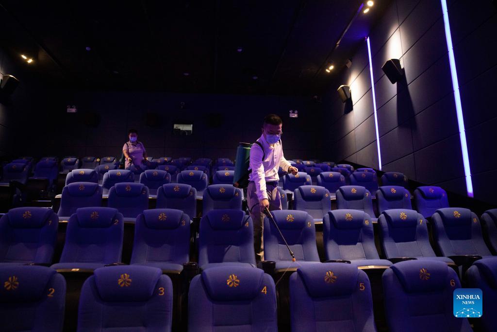 Staff members disinfect a cinema in Harbin, northeast China's Heilongjiang Province, Nov. 18, 2021. Harbin terminated its emergency responses to COVID-19 on Thursday and started advancing the full restoration of the normal economic and social order after the recent resurgence of COVID-19 has been subdued. (Xinhua/Zhang Tao)