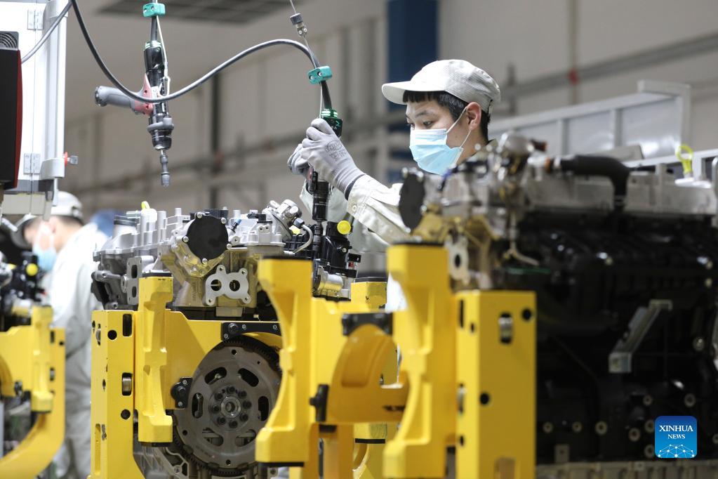 A worker assembles an engine at a manufacturer in Harbin, northeast China's Heilongjiang Province, Nov. 18, 2021. Harbin terminated its emergency responses to COVID-19 on Thursday and started advancing the full restoration of the normal economic and social order after the recent resurgence of COVID-19 has been subdued. (Xinhua/Zhang Tao)