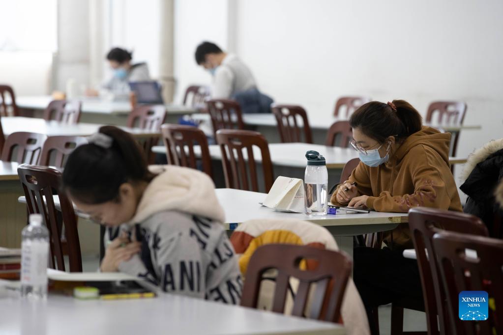 People read at the provincial library in Harbin, northeast China's Heilongjiang Province, Nov. 18, 2021. Harbin terminated its emergency responses to COVID-19 on Thursday and started advancing the full restoration of the normal economic and social order after the recent resurgence of COVID-19 has been subdued. (Xinhua/Zhang Tao)