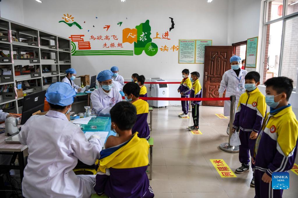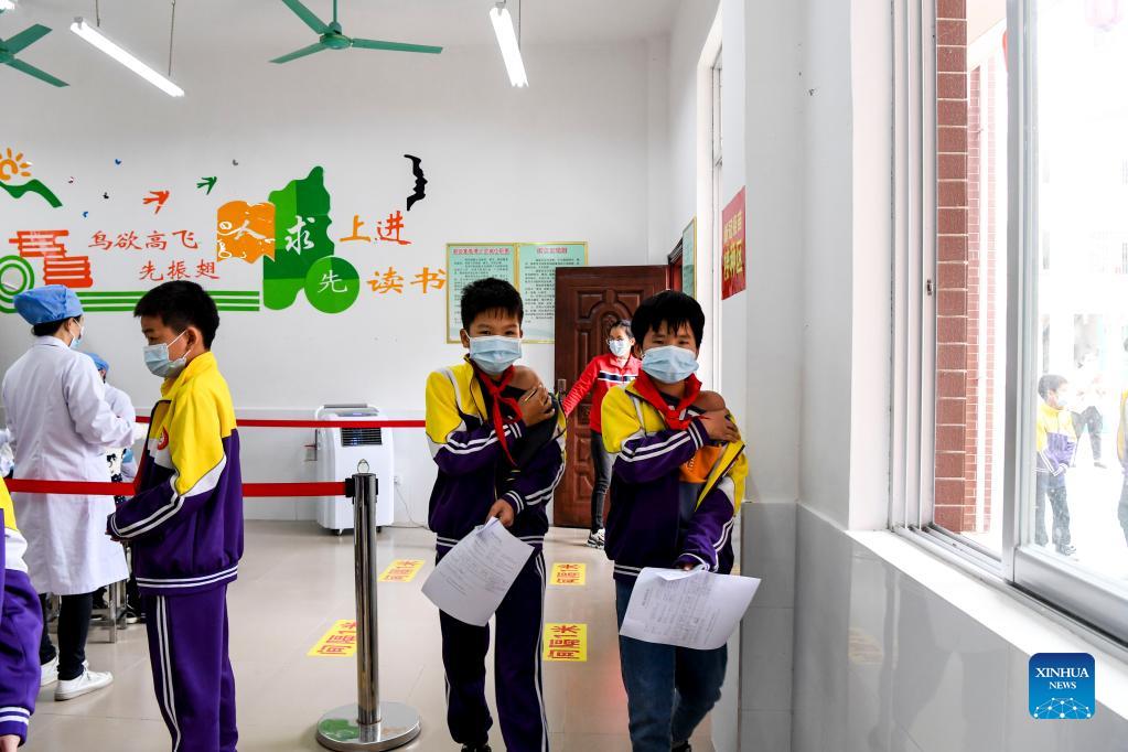 Pupils get inoculated with the COVID-19 vaccines at Weiming elementary school in Weiming Village, Shinan Township, Xingye County, south China's Guangxi Zhuang Autonomous Region, Nov. 18, 2021. Local health authorities of Xingye County in Guangxi recently promoted the inoculation of the COVID-19 vaccine on children aged three to eleven in remote rural areas. (Xinhua/Cao Yiming)