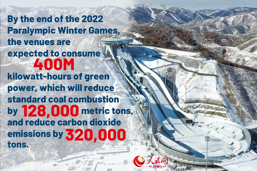 "As of May 26th, 19 venues for the Games are being powered by green electricity in advance during construction and all venues will use the clean energy supply during the Games," said Liu Yumin, director of the Planning and Construction Department at BOCOG. "By the end of the 2022 Paralympic Winter Games, these venues are expected to consume 400 million kilowatt-hours of green power, which will reduce standard coal combustion by 128,000 metric tons, and reduce carbon dioxide emissions by 320,000 tons."
