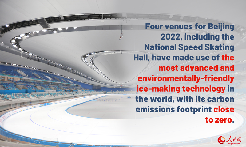 To make the Games as environmentally sustainable as possible, China has prioritized the construction of green venues. All of the newly-built venues use optimized construction materials that meet the three-star standard of green buildings. Cutting-edge technologies were adopted at venues to reduce carbon emissions. For instance, four venues, including the National Speed Skating Hall, have made use of the most advanced and environmentally-friendly ice-making technology in the world, with its carbon emissions footprint close to zero. For the first time in Olympic history, carbon dioxide was used as a refrigerant during the ice-making process at skating rink venues. Compared with the traditional refrigeration approach, this method for making ice requires less time and is 30 percent more efficient.