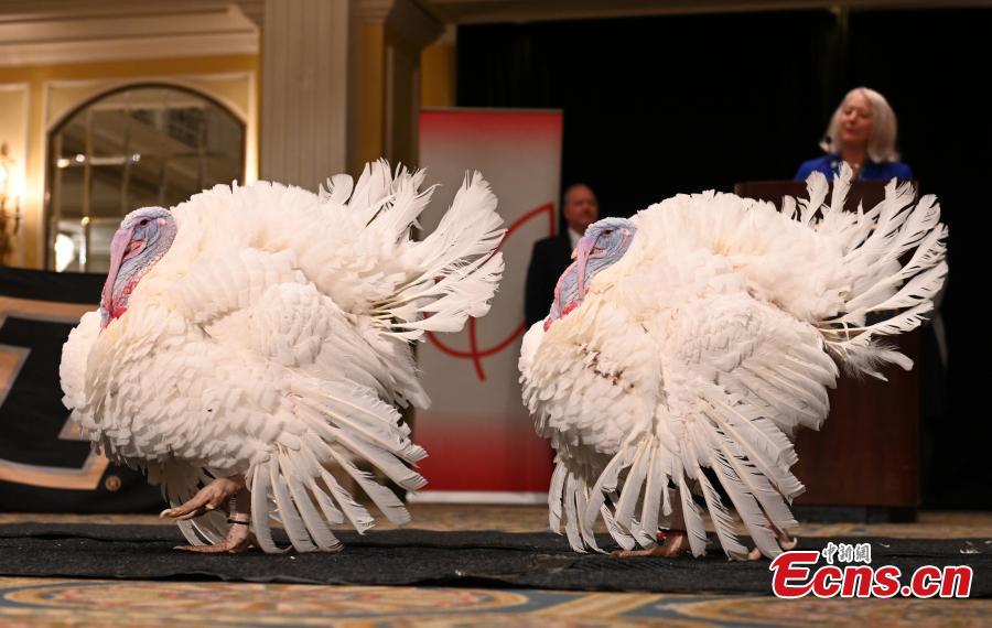 Two turkeys named Peanut Butter and Jelly are presented in Washington, D.C., the United States, Nov. 18, 2021. They will be pardoned by the U.S. President for the 2021 Thanksgiving Day. (Photo: China News Service/Chen Mengtong)