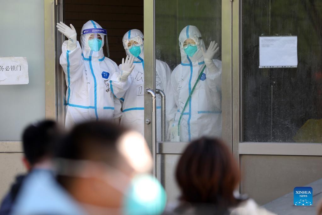 Medical workers wave to the cured patients discharged from the isolation ward in Dalian, northeast China's Liaoning Province, Nov. 19, 2021. The first batch of three patients and one asymptomatic person in the latest COVID-19 epidemic were discharged from hospital on Friday in Dalian. They will continue a 14-day isolated medical observation in designated hospitals. (Xinhua/Yao Jianfeng)