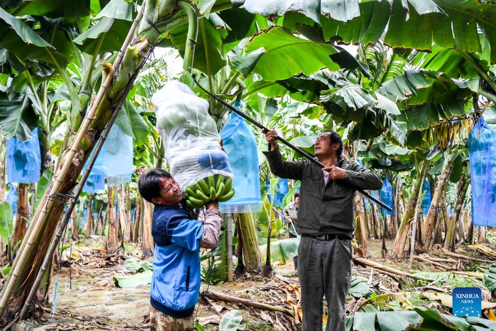 Farmers harvest bananas in Sanlian Village of Dapingshan Town in Xingye County, south China's Guangxi Zhuang Autonomous Region, Nov. 19, 2021. During the past years, Xingye has made great efforts to promote characteristic industries based on local conditions such as introducing advanced farming and cultivating techniques and better types of agricultural products, so as to boost farmers' income. (Xinhua/Cao Yiming)