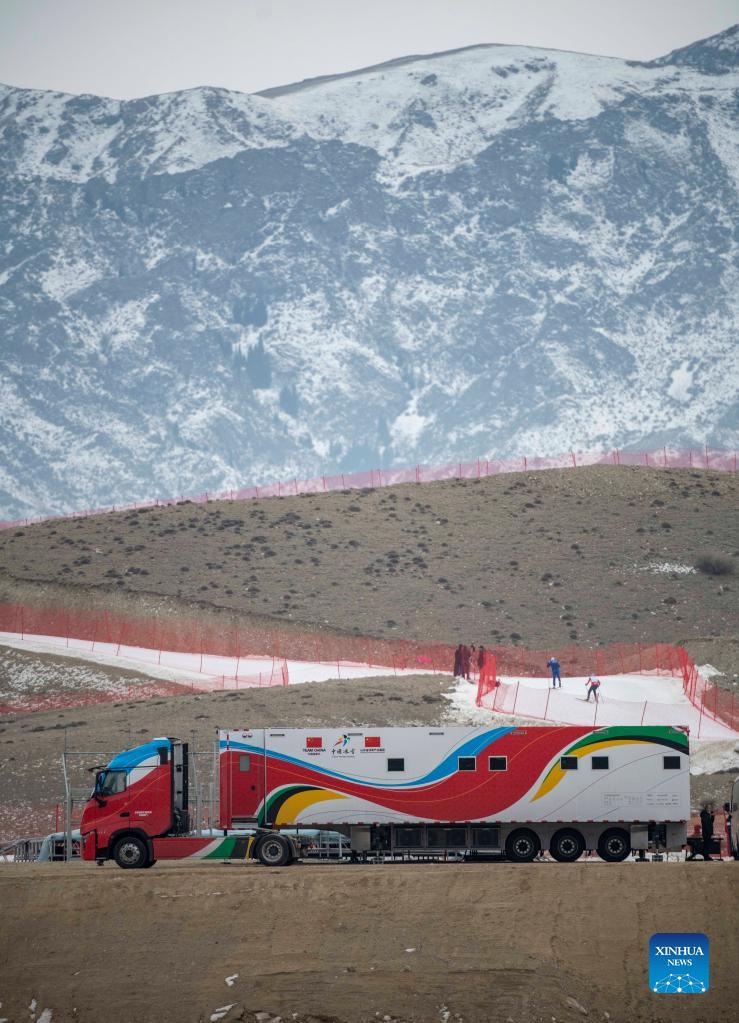 Photo shows the new waxing truck in Wenquan County, northwest China's Xinjiang Uygur Autonomous Region, Nov. 17, 2021. China's very first self-developed waxing truck was deployed during the Chinese national cross-country skiing team training session for the 2022 Olympic Winter Games. It comes with 6 waxing benches, cabins for storaging and other uses. (Xinhua/Hu Huhu)