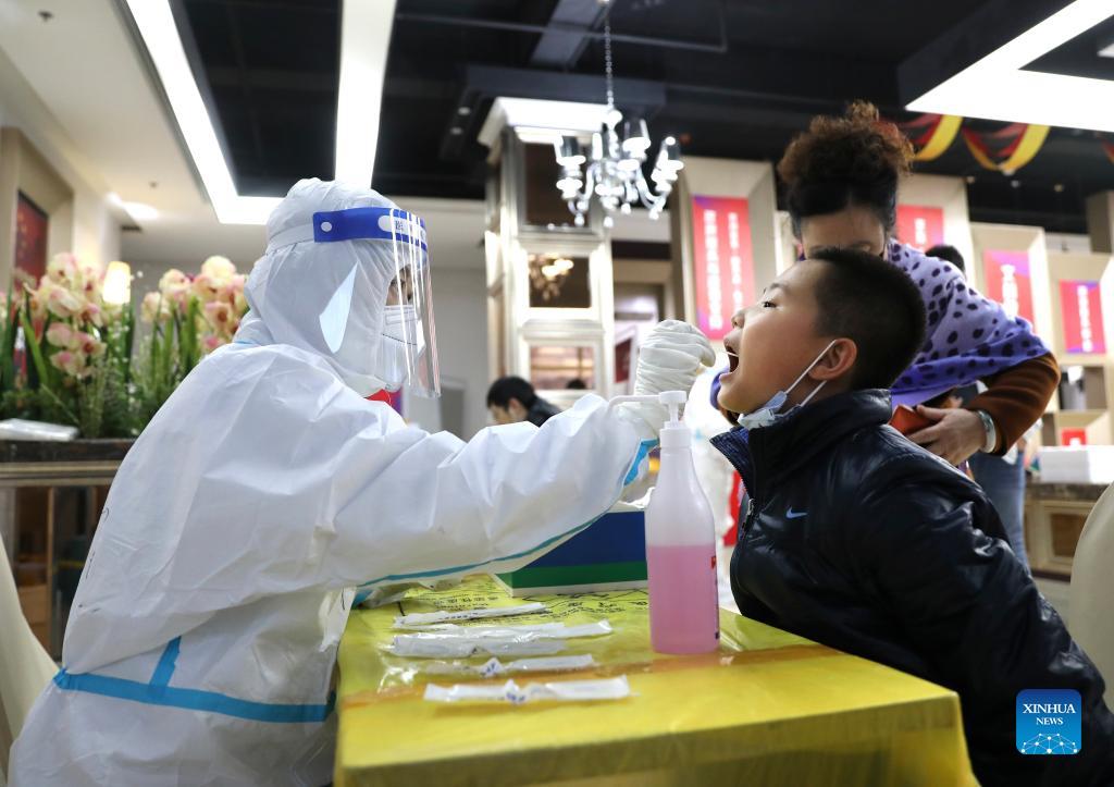 A medical worker takes a swab sample from a resident for nucleic acid test at a testing site in Dalian, northeast China's Liaoning Province, Nov. 17, 2021. Dalian on Wednesday started a new round of citywide nucleic acid testing to curb the spread of COVID-19. (Xinhua/Yao Jianfeng)