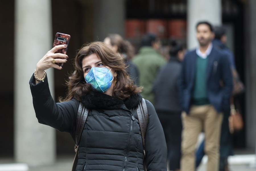 A woman wearing a mask takes a selfie in Covent Garden in London, Britain, on Nov. 9, 2021. (Photo by Stephen Chung/Xinhua)