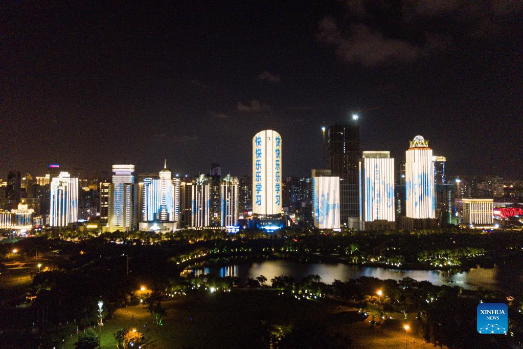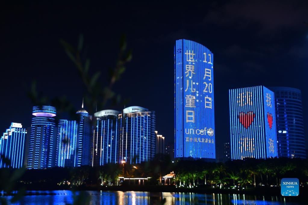 Several buildings along Binhai Avenue are lit up blue to celebrate World Children's Day in Haikou, south China's Hainan Province, Nov. 20, 2021. A total of 23 Chinese cities on Saturday lit iconic buildings and monuments blue, including a section of the Great Wall of China, to mark World Children's Day. The celebration, hosted by UNICEF, was livestreamed due to COVID-19 and called on society as a whole to unite for girls' and boys' rights to health, education, protection and participation. World Children's Day commemorates the adoption of the Convention on the Rights of the Child on Nov. 20, 1989. China ratified the convention in 1992. (Xinhua/Pu Xiaoxu)