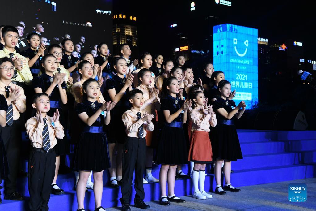 Children from Shenzhen in south China's Guangdong Province and South China's Hong Kong sing songs to celebrate World Children's Day at a lighting ceremony in Shenzhen, Nov. 20, 2021. A total of 23 Chinese cities on Saturday lit iconic buildings and monuments blue, including a section of the Great Wall of China, to mark World Children's Day. The celebration, hosted by UNICEF, was livestreamed due to COVID-19 and called on society as a whole to unite for girls' and boys' rights to health, education, protection and participation. World Children's Day commemorates the adoption of the Convention on the Rights of the Child on Nov. 20, 1989. China ratified the convention in 1992. (Xinhua/Liang Xu)