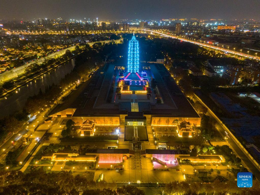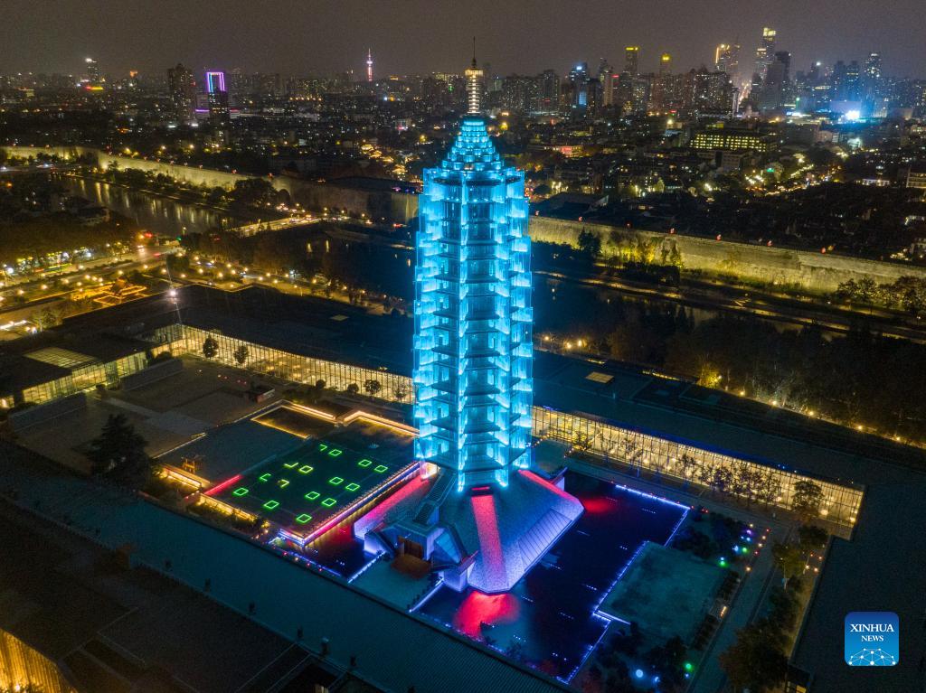 Aerial photo taken on Nov. 20, 2021 shows the Grand Baoen Temple Heritage and Scenic Area lit up blue to celebrate World Children's Day in Nanjing, east China's Jiangsu Province. A total of 23 Chinese cities on Saturday lit iconic buildings and monuments blue, including a section of the Great Wall of China, to mark World Children's Day. The celebration, hosted by UNICEF, was livestreamed due to COVID-19 and called on society as a whole to unite for girls' and boys' rights to health, education, protection and participation. World Children's Day commemorates the adoption of the Convention on the Rights of the Child on Nov. 20, 1989. China ratified the convention in 1992. (Xinhua/Li Bo)
