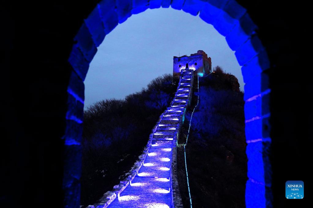 The Simatai section of the Great Wall is lit up blue to celebrate World Children's Day in Beijing, capital of China, Nov. 20, 2021. A total of 23 Chinese cities on Saturday lit iconic buildings and monuments blue, including a section of the Great Wall of China, to mark World Children's Day. The celebration, hosted by UNICEF, was livestreamed due to COVID-19 and called on society as a whole to unite for girls' and boys' rights to health, education, protection and participation. World Children's Day commemorates the adoption of the Convention on the Rights of the Child on Nov. 20, 1989. China ratified the convention in 1992. (UNICEF/Handout via Xinhua)