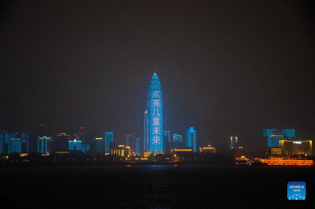 The Tinyuet Bund Financial Center is lit up blue to celebrate World Children's Day in Wuhan, central China's Hubei Province, Nov. 20, 2021. A total of 23 Chinese cities on Saturday lit iconic buildings and monuments blue, including a section of the Great Wall of China, to mark World Children's Day. The celebration, hosted by UNICEF, was livestreamed due to COVID-19 and called on society as a whole to unite for girls' and boys' rights to health, education, protection and participation. World Children's Day commemorates the adoption of the Convention on the Rights of the Child on Nov. 20, 1989. China ratified the convention in 1992. (Photo by Wu Zhizun/Xinhua)