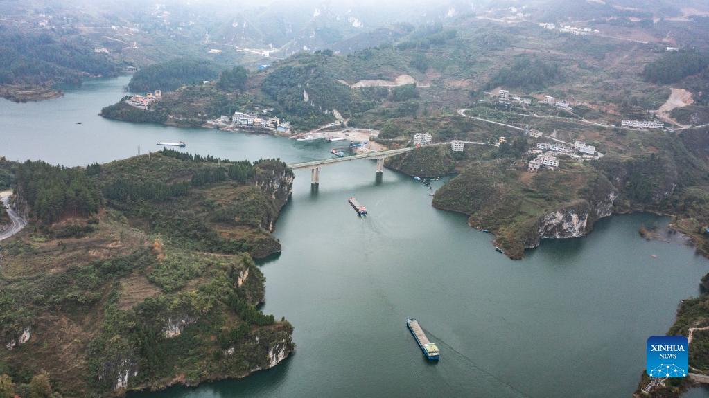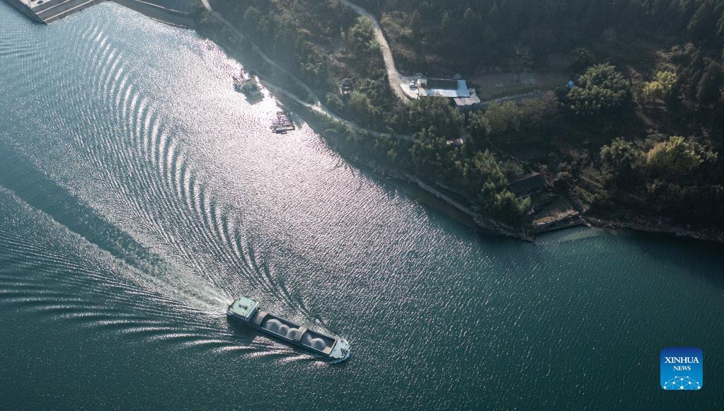 Aerial photo taken on Nov. 19, 2021 shows a cargo ship loaded with phosphate ore sailing on the Wujiang River in Sinan County, southwest China's Guizhou Province. The Wujiang River waterway in Guizhou, which had been cut off for nearly 20 years due to the construction of hydropower stations along the river, has fully resumed to traffic recently. (Xinhua/Tao Liang)