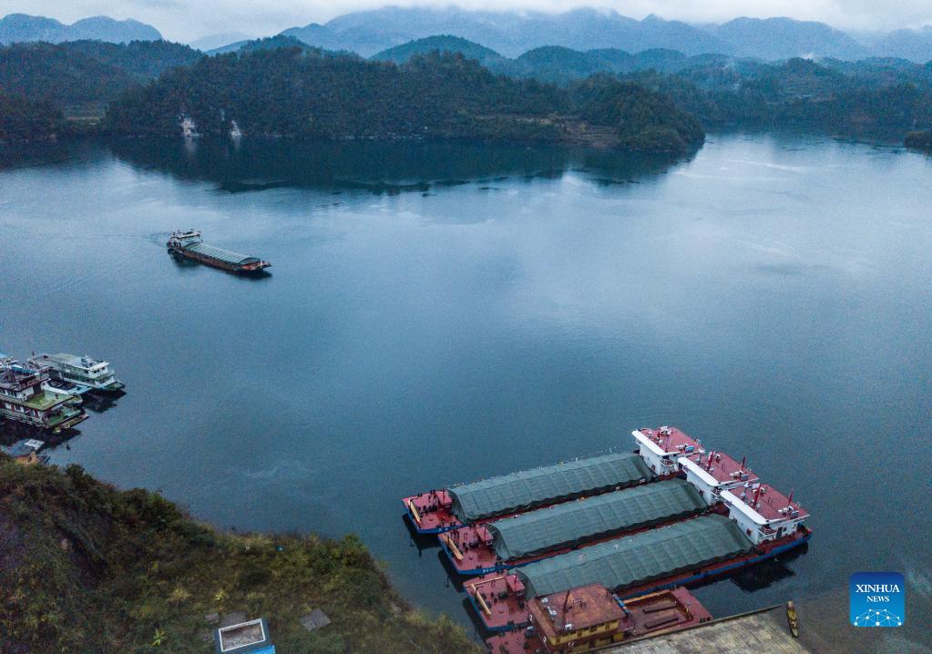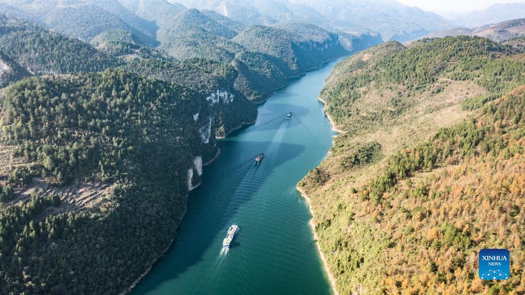 Aerial photo taken on Nov. 19, 2021 shows cargo ships loaded with phosphate ore sailing on the Wujiang River in Sinan County, southwest China's Guizhou Province. The Wujiang River waterway in Guizhou, which had been cut off for nearly 20 years due to the construction of hydropower stations along the river, has fully resumed to traffic recently. (Xinhua/Tao Liang)