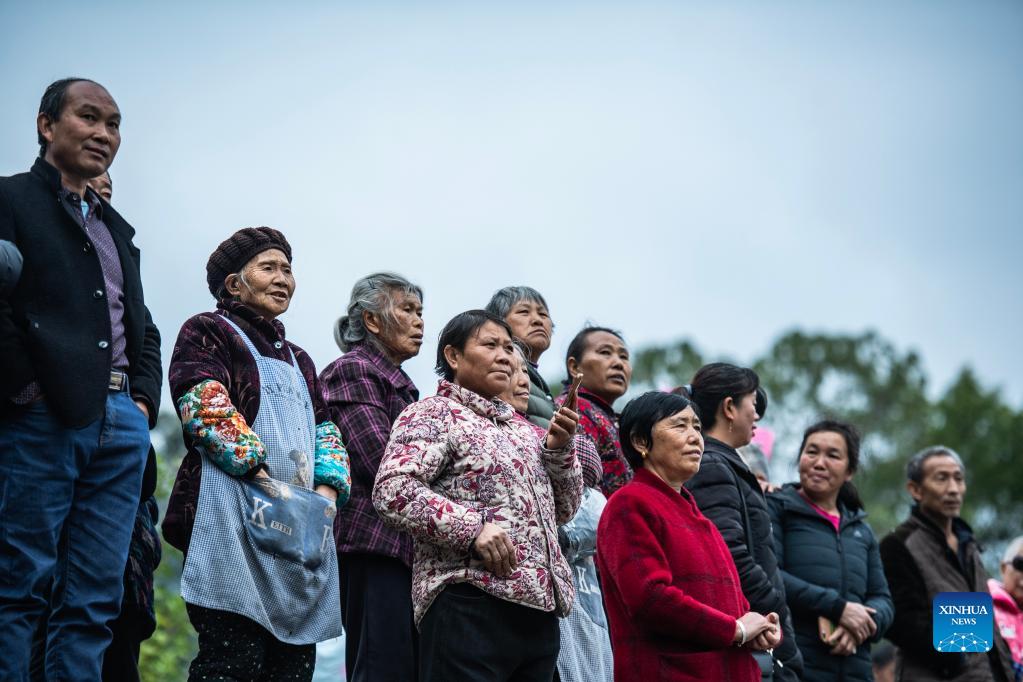 Villagers watch a cargo ship loaded with phosphate ore leaving a pier in Guiyang, southwest China's Guizhou Province, Nov. 16, 2021. The Wujiang River waterway in Guizhou, which had been cut off for nearly 20 years due to the construction of hydropower stations along the river, has fully resumed to traffic recently. (Xinhua/Tao Liang)