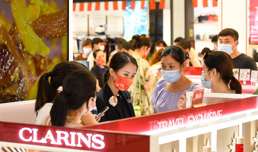 Tourists go shopping at a duty-free shopping mall in Haikou, south China's Hainan Province, Oct. 1, 2021. (Xinhua/Yang Guanyu)