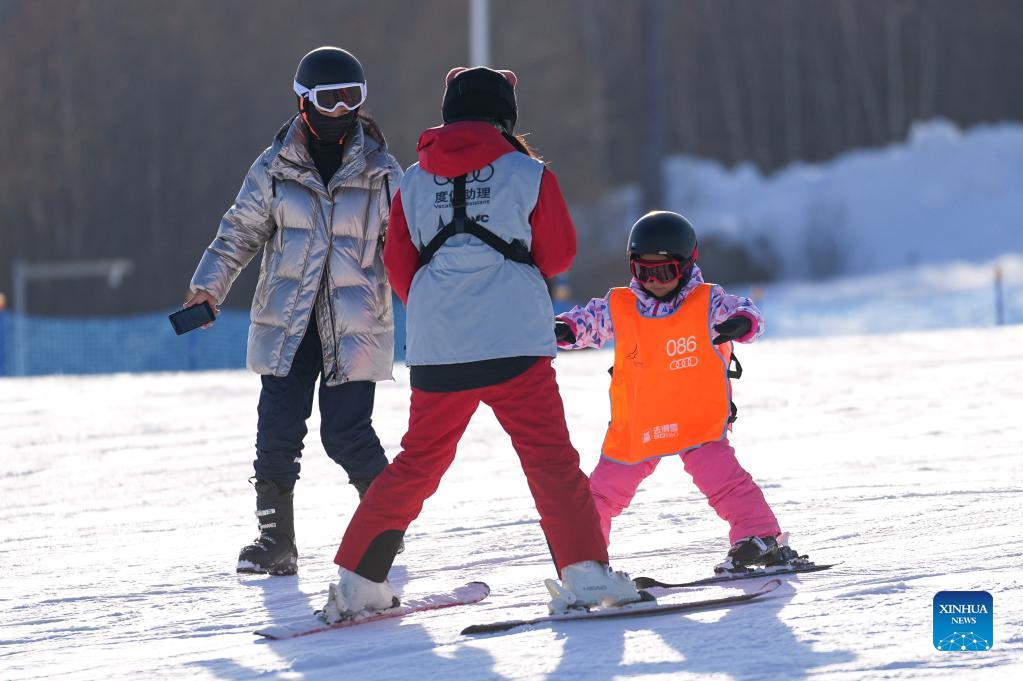A child learns to ski under instructions of a coach at White Mountain Resort in Fusong, northeast China's Jilin Province, Nov. 19, 2021. As the 2022 Beijing Winter Olympics approaches, ski resorts in Jilin are seeing an increasing visits by children, many of whom take courses with the support of their ski-loving parents. (Xinhua/Xu Chang)