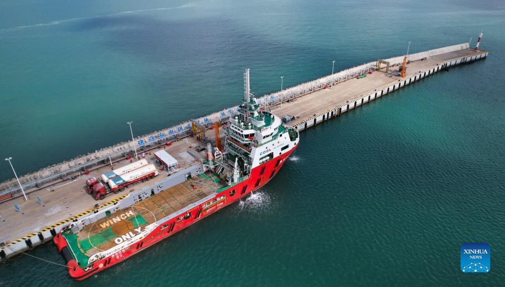 Aerial photo taken on Nov. 20, 2021 shows a berthed ship being filled with liquefied natural gas (LNG) at an LNG filling station in Macun port of Chengmai County, south China's Hainan Province. The offshore LNG filling station, built and operated by China National Offshore Oil Corporation (CNOOC) Gas &Power Group, opened for operation on Saturday in Macun port of Hainan Province. (Xinhua/Yang Guanyu)