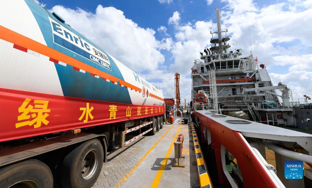 Staff members fill liquefied natural gas (LNG) into a ship at an LNG filling station in Macun port of Chengmai County, south China's Hainan Province, Nov. 20, 2021. The offshore LNG filling station, built and operated by China National Offshore Oil Corporation (CNOOC) Gas &Power Group, opened for operation on Saturday in Macun port of Hainan Province. (Xinhua/Yang Guanyu)