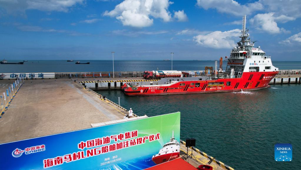 Aerial photo taken on Nov. 20, 2021 shows a berthed ship being filled with liquefied natural gas (LNG) at an LNG filling station in Macun port of Chengmai County, south China's Hainan Province. The offshore LNG filling station, built and operated by China National Offshore Oil Corporation (CNOOC) Gas &Power Group, opened for operation on Saturday in Macun port of Hainan Province. (Xinhua/Yang Guanyu)