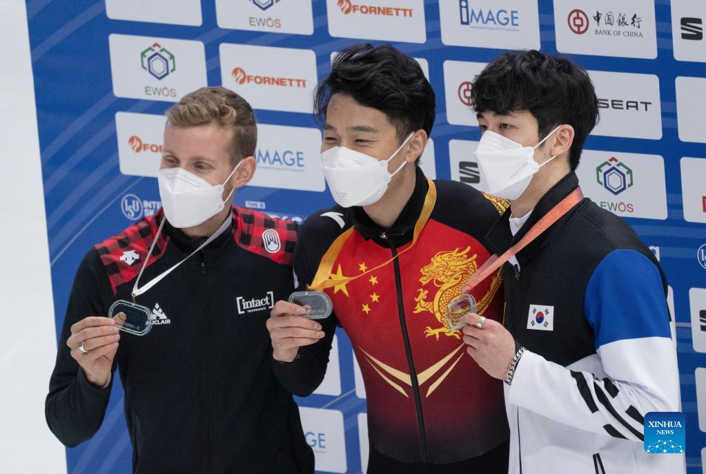 Gold medalist Ren Ziwei (C) of China, silver medalist Pascal Dion (L) of Canada and bronze medalist Park Jang Hyuk of South Korea celebrate during the awarding ceremony after the men's 1500m final at the ISU World Cup Short Track Speed Skating series in Debrecen, Hungary, Nov. 20, 2021. (Photo by Attila Volgyi/Xinhua)