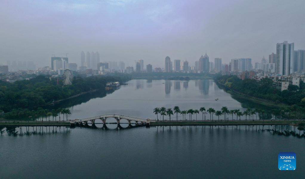 Aerial photo taken on Nov. 21, 2021 shows the Nanhu lake in rain and mist in Nanning, south China's Guangxi Zhuang Autonomous Region. (Xinhua/Huang Xiaobang)