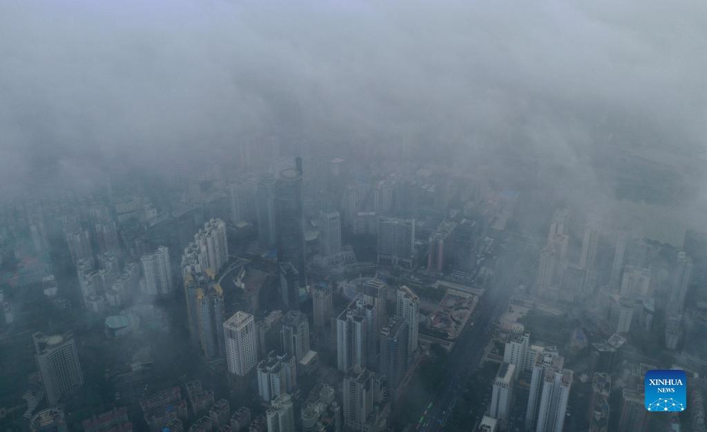 Aerial photo taken on Nov. 21, 2021 shows a city view in rain and mist in Nanning, south China's Guangxi Zhuang Autonomous Region. (Xinhua/Huang Xiaobang)