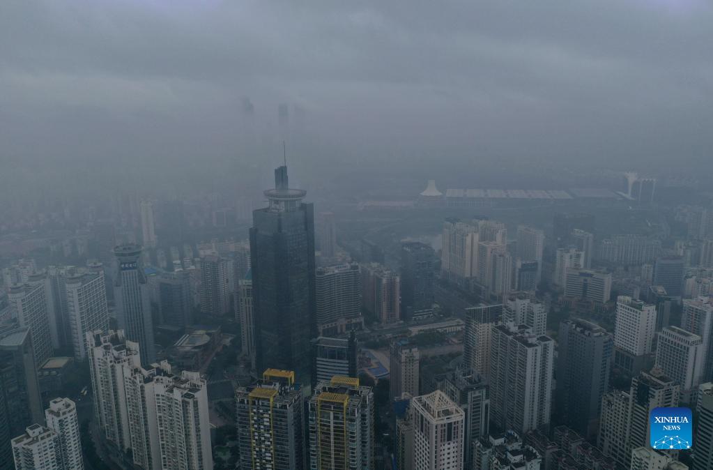 Aerial photo taken on Nov. 21, 2021 shows a city view in rain and mist in Nanning, south China's Guangxi Zhuang Autonomous Region. (Xinhua/Huang Xiaobang)
