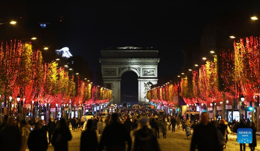 The Champs-Elysees Avenue and the Arc de Triomphe are seen amid Christmas illuminations in Paris, France, Nov. 21, 2021. The annual Christmas season lighting ceremony was held here on Sunday. (Xinhua/Gao Jing)