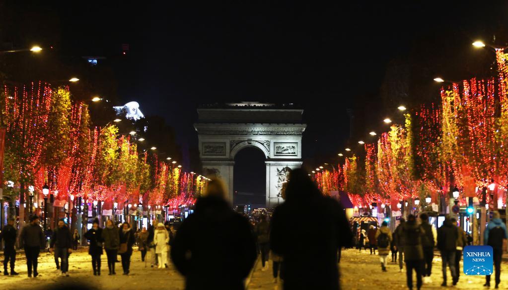 The Champs-Elysees Avenue and the Arc de Triomphe are seen amid Christmas illuminations in Paris, France, Nov. 21, 2021. The annual Christmas season lighting ceremony was held here on Sunday. (Xinhua/Gao Jing)