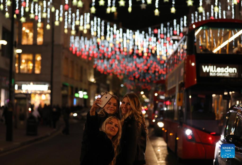 People take selfies on Oxford Street decorated with Christmas lights in central London, Britain, on Nov. 21, 2021. (Xinhua/Li Ying)