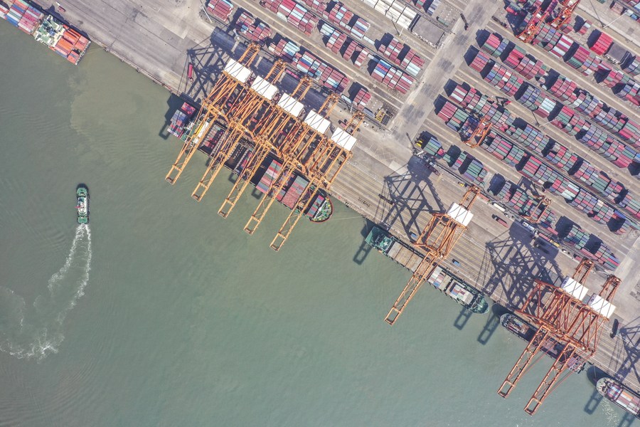 Aerial photo taken on Jan. 14, 2021 shows a view of the container wharf of Qinzhou Port, south China's Guangxi Zhuang Autonomous Region. (Xinhua/Cao Yiming)