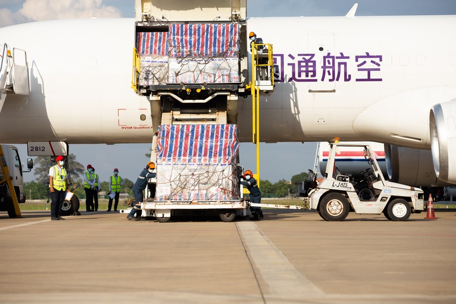 Staff members unload China-aided medical supplies at Wattay International Airport in Vientiane, Laos, Nov. 17, 2021. (Photo by Kaikeo Saiyasane/Xinhua)
