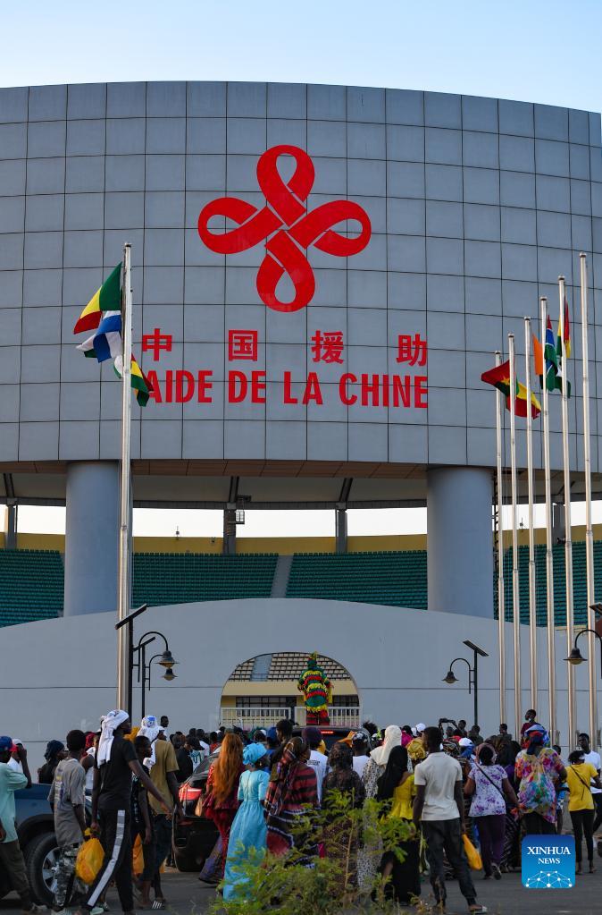 People arrive at the National Wrestling Arena in Dakar, Senegal, Nov. 21, 2021. The arena, the first modern one in Africa, is the largest aid project China has carried out in Senegal. (Xinhua/Li Yan)