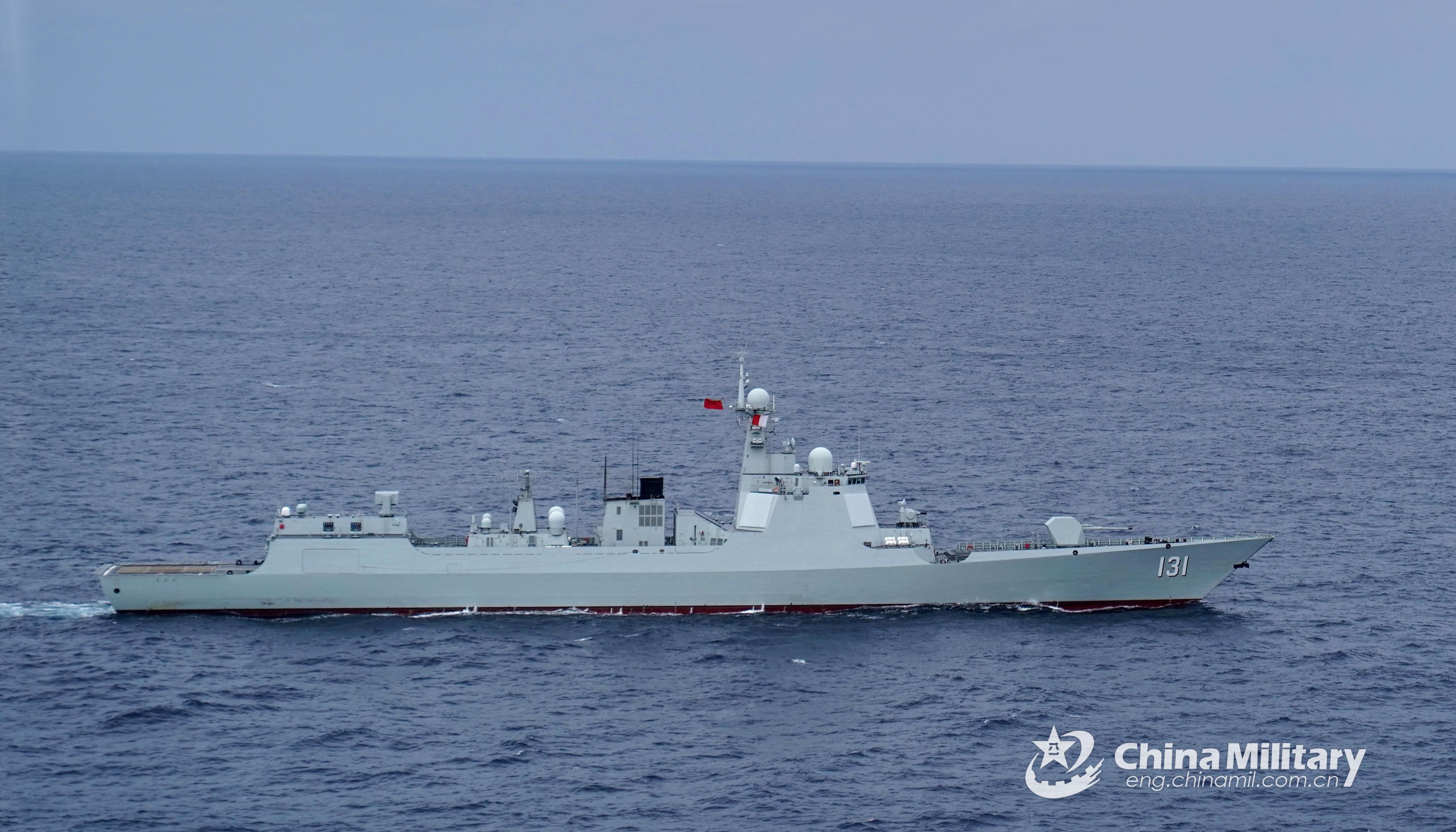 The guided-missile destroyer Taiyuan (Hull 131) attached to a destroyer flotilla with the navy under the PLA Eastern Theater Command steams in waters of the East China Sea during a realistic combat training exercise in early November, 2021. (eng.chinamil.com.cn/Photo by Liu Yaxun)