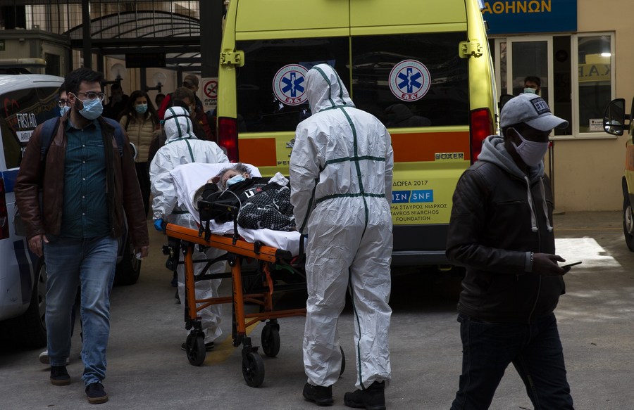 Health workers transfer a patient to a hospital in Athens, Greece, March 11, 2021. (Xinhua/Marios Lolos)