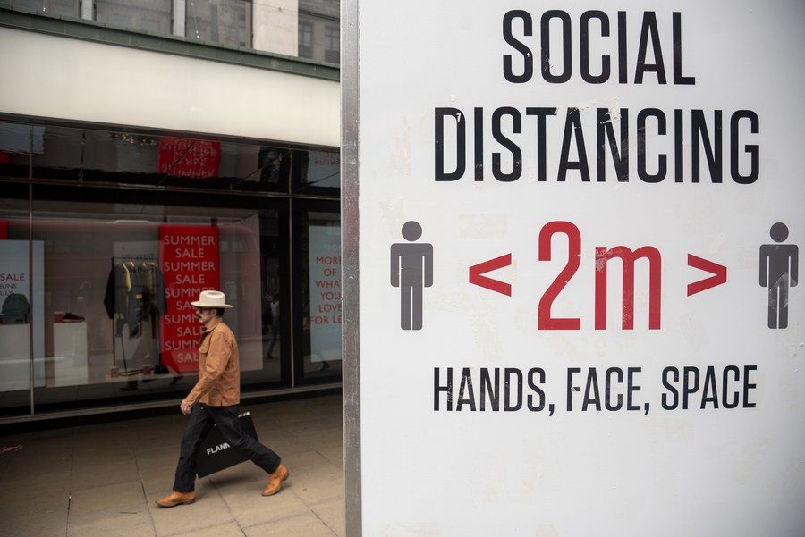 A man walks past a social distancing sign on a street in London, Britain, on July 12, 2021. (Xinhua/Ray Tang)