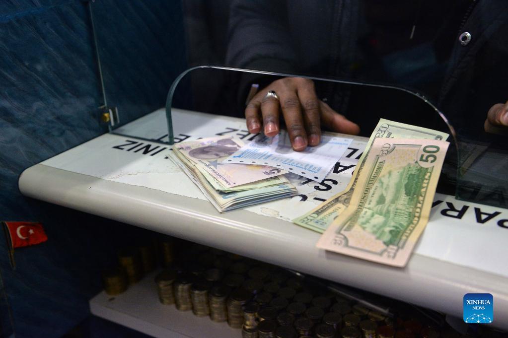 A customer exchanges money in an exchange office in Ankara, Turkey, on Nov. 23, 2021. The Central Bank of the Republic of Turkey (CBRT) said Tuesday that it upholds its policy of implementing a floating exchange rate and has no commitment to "any exchange rate level" as the lira, the country's currency, nosedived in forex markets to a record low. The Turkish lira's exchange rate on Tuesday lost nearly 10 percent to 13.44 liras against the U.S. dollar before recovering some of its loss in late afternoon. (Photo by Mustafa Kaya/Xinhua)