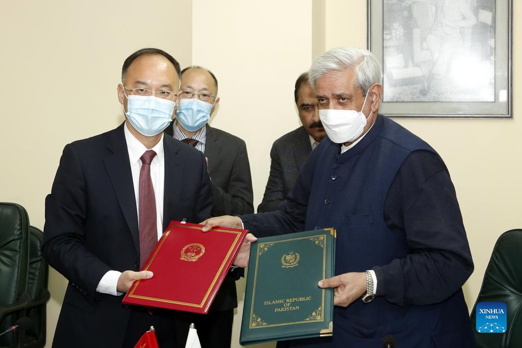 Pakistan's Federal Minister for National Food Security and Research Syed Fakhar Imam (R, Front) and Chinese Ambassador to Pakistan Nong Rong (L, Front) exchange documents of the Protocol of Inspection and Quarantine Requirements for the Export of Onion from Pakistan to China, during a signing ceremony in Islamabad, Pakistan, on Nov. 23, 2021. The Protocol of Inspection and Quarantine Requirements for the Export of Onion from Pakistan to China was signed during the ceremony here on Tuesday. (Xinhua/Ahmad Kamal)
