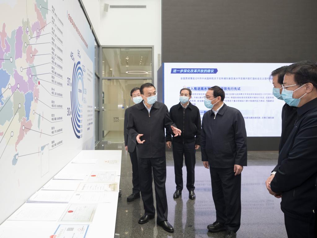 Chinese Premier Li Keqiang, also a member of the Standing Committee of the Political Bureau of the Communist Party of China Central Committee, learns about the institutional innovations by the China (Shanghai) Pilot Free Trade Zone in investment, trade and finance at an industrial park of smart manufacturing companies in east China's Shanghai, Nov. 22, 2021. Li made an inspection tour of Shanghai from Monday to Tuesday. (Xinhua/Wang Ye)