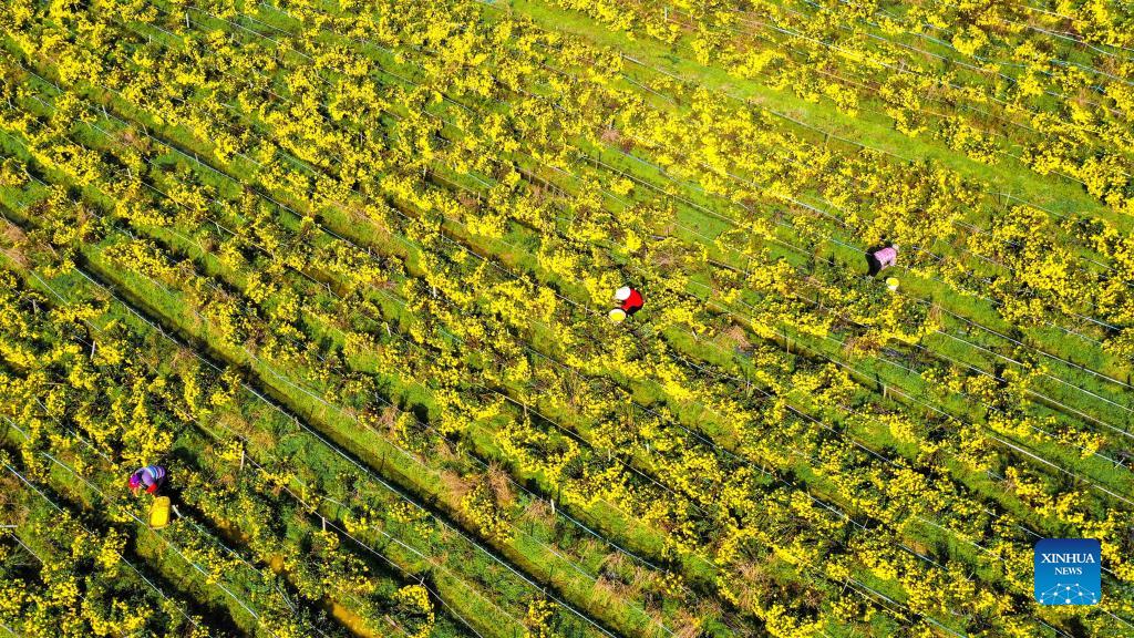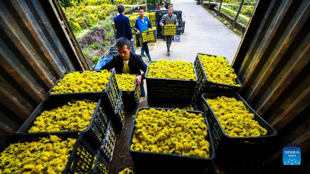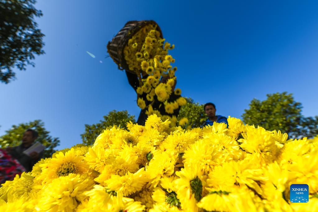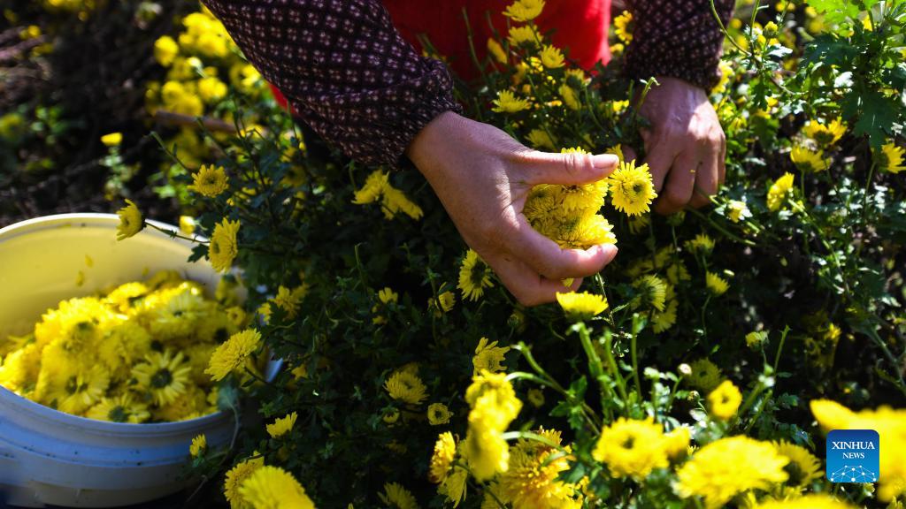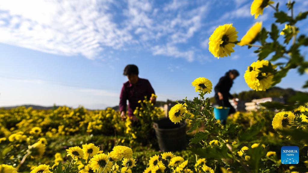 Villagers harvest chrysanthemums in Qianjia Village, central China's Hunan