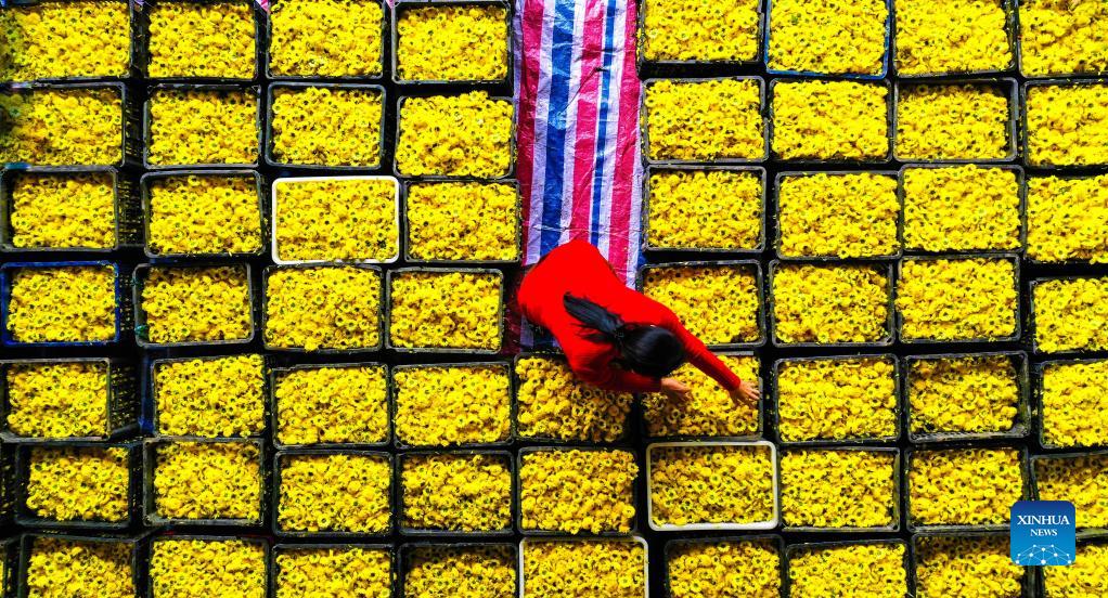 Villagers harvest chrysanthemums in Qianjia Village of Sanjiaotang Township, Changning City, Hengyang, central China's Hunan Province, Nov. 23, 2021. (Photo by Zhou Xiuyuchun/Xinhua)