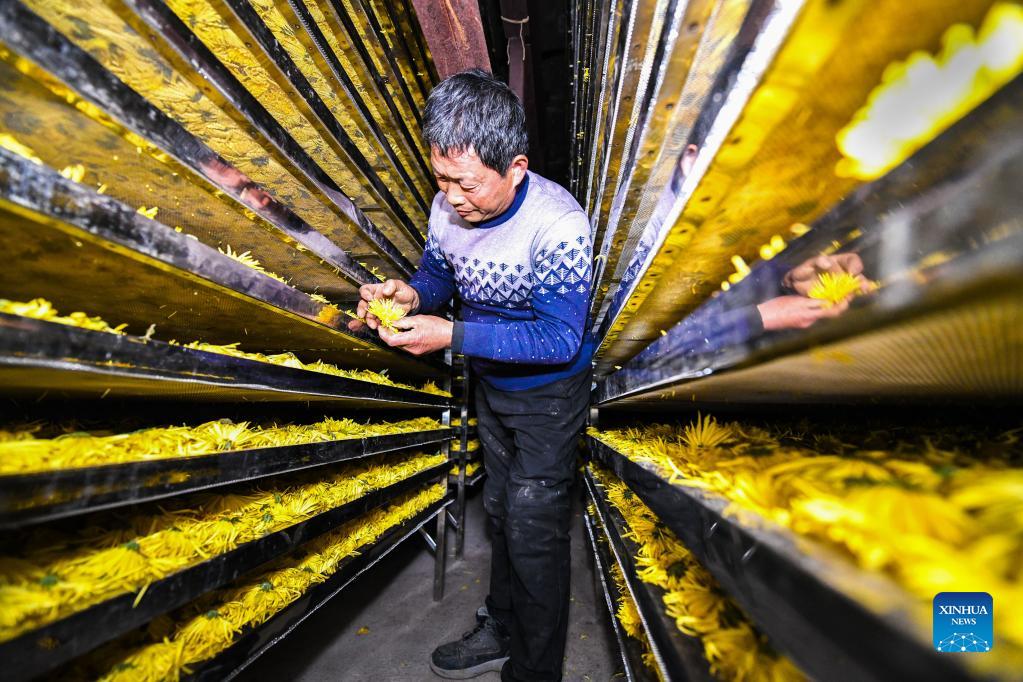 A villager checks the drying of chrysanthemums at a workshop in Qianjia Village of Sanjiaotang Township, Changning City, Hengyang, central China's Hunan Province, Nov. 23, 2021. (Photo by Zhou Xiuyuchun/Xinhua)