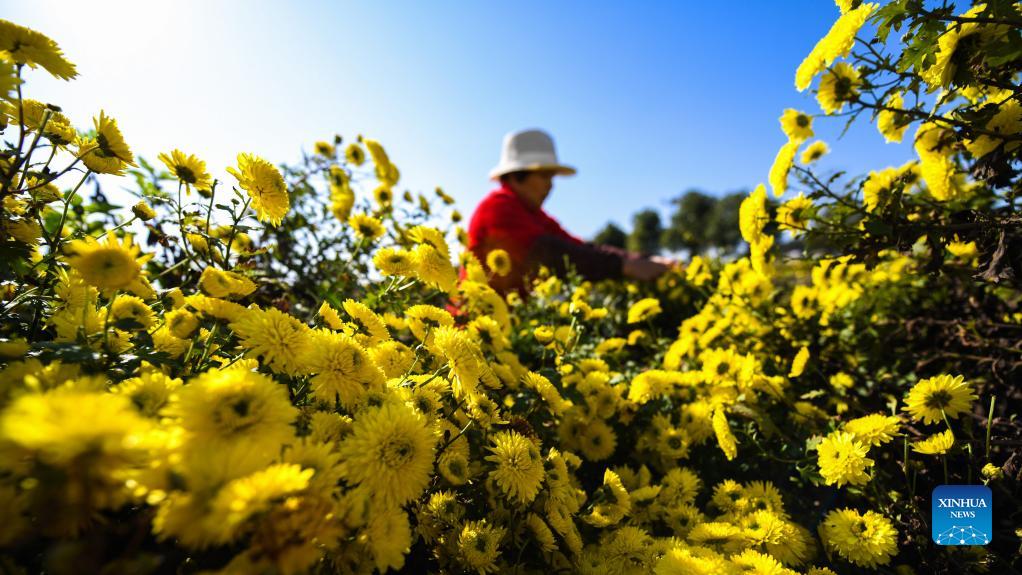 A villager harvests chrysanthemums in Qianjia Village of Sanjiaotang Township, Changning City, Hengyang, central China's Hunan Province, Nov. 23, 2021. (Photo by Zhou Xiuyuchun/Xinhua)