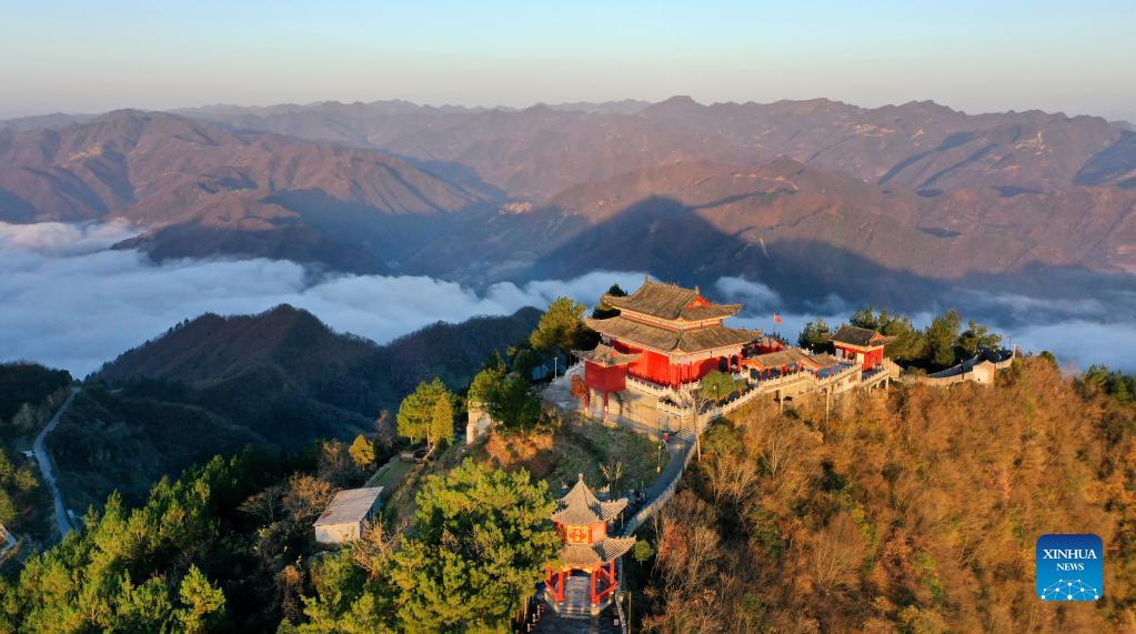 Aerial photo taken Nov. 23, 2021 shows the scenery of Miaoshanzhai scenic area in Baihe County, northwest China's Shaanxi Province. (Xinhua/Tao Ming)
