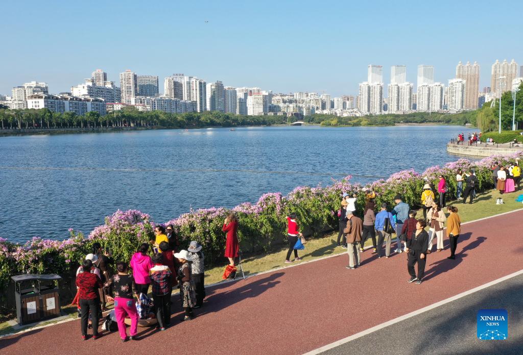 Photo taken with a drone on Nov. 23, 2021 shows people viewing flowers by the Nanhu Lake in Nanning, south China's Guangxi Zhuang Autonomous Region. (Xinhua/Lu Boan)