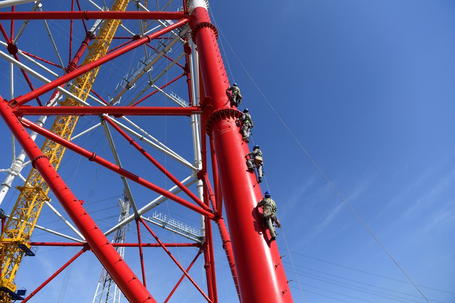 Workers climb a power transmission tower by the Yangtze River in Wuhu, east China's Anhui Province, Nov. 11, 2021. (Xinhua/Du Yu)