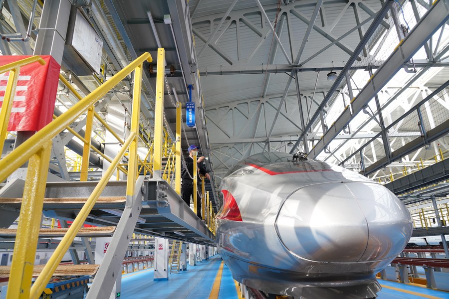 Photo taken on Jan. 6, 2021 shows the high-speed Electric Multiple Unit (EMU) named Fuxing in China Railway Beijing Group Co., Ltd. in Beijing, capital of China. (Xinhua/Chen Zhonghao)