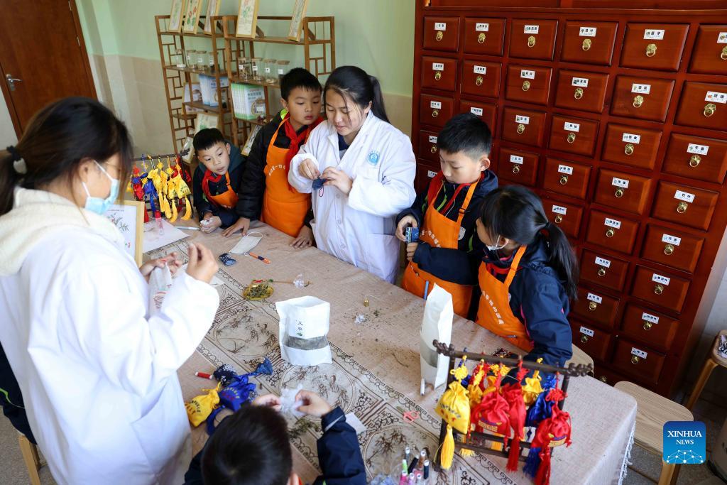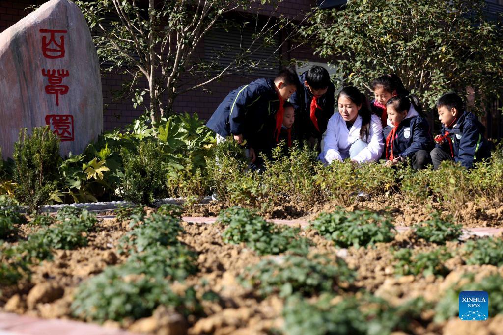 Students of Xingfulu Primary School in Yaohai District, Hefei City, east China's Anhui Province, learn knowledge about traditional Chinese medicine at the school's herbal medicine workshop on Nov. 24, 2021. (Xinhua/Xie Chen)